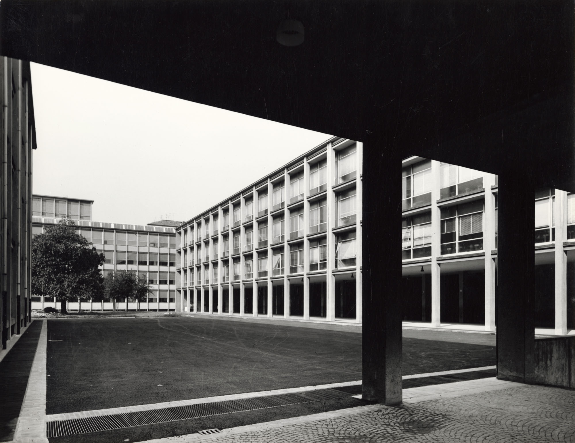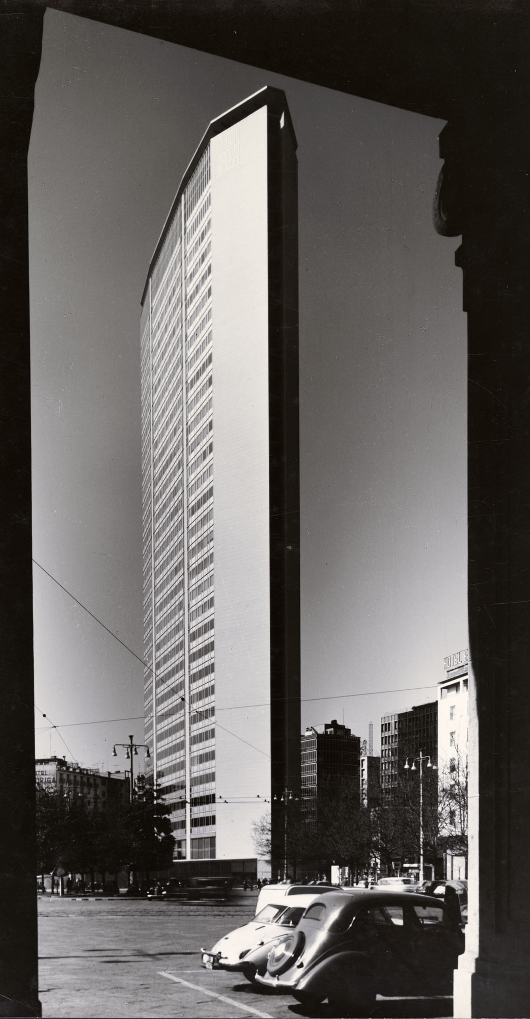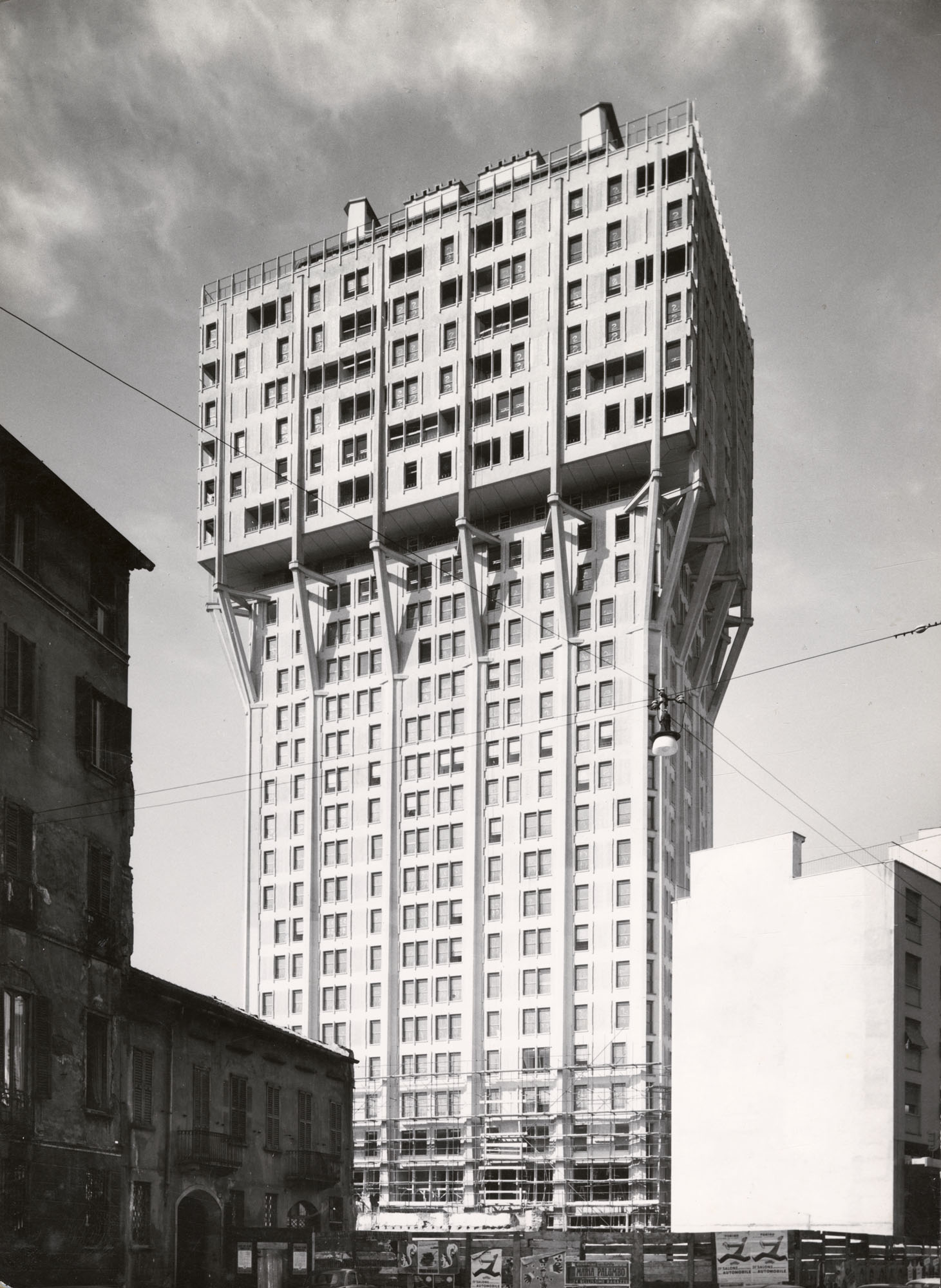 Di fronte al grattacielo Pirelli, tra il 1956 e il 1959, gli architetti Ermenegildo ed Eugenio Soncini, coadiuvati dagli ingegneri Pier Luigi Nervi e Giuseppe Pestalozza, eressero un edificio alto circa 40 metri, affiancato da due corpi minori, destinato a ospitare i nuovi uffici della Galbani spa, fondata nel 1880. La società vi si trasferì nel 1960. La torre, dalla particolare forma prismatica asimmetrica, secondo la richiesta dei committenti doveva essere la vetrina dell’azienda e quindi caratterizzarsi non solo sul piano architettonico, ma anche artistico. Ecco che alla sommità del palazzo, un involucro di lastre in cristallo verde-azzurro, venne posta la scultura geometrica dell’artista Enrico Ciuti, parte integrante dell’edificio e perfetto esempio del dialogo tra architettura e arte. Come per il grattacielo Pirelli, Pier Luigi Nervi e Gaspare Pestalozza idearono per l’edificio della Galbani una soluzione strutturale che prevedeva pochi pilastri sui quali scaricare il peso dei solai prefabbricati autoportanti di soli tre centimetri di spessore, garantendo la più ampia flessibilità distributiva degli uffici interni.